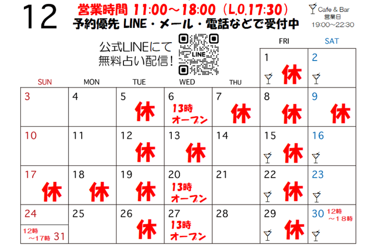 2023/11/29こんばんは。 浅草の開運占いカフェFullMoonです。 11月の営業も明日で終わりですね。 来月の営業予定を確認していたところ、今年ももうすぐ終わりということを実感するばかりです。 まだまだやり残したと思う事が多いのですが、やれる事をやっていこうと思うばかりです。 そんな中での12月の営業予定は以下の通りとなります。 9日は越谷のカルチャーセンターでタロットカードの講座を行うため、お休みとさせ... -