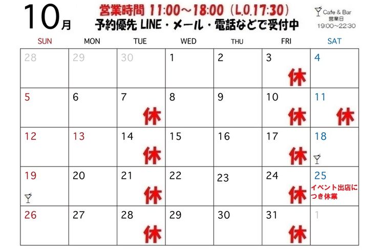 2025/10/01こんにちは。 浅草の開運占いカフェFullMoonです。 気づけば10月になり、気温も下がりましたね。 10月1日の気温は一気に下がりすぎな気もしますが…みなさまはいかがお過ごしでしょうか。 2025年も残り3か月となりました。 残りを良い日々として過ごせるようにしたいですね。 そんな思いを胸に10月の営業予定です。 臨時休業が入りましたら申し訳ありません。 10月の週末カフェバーは18・19の2日のみです。 通...